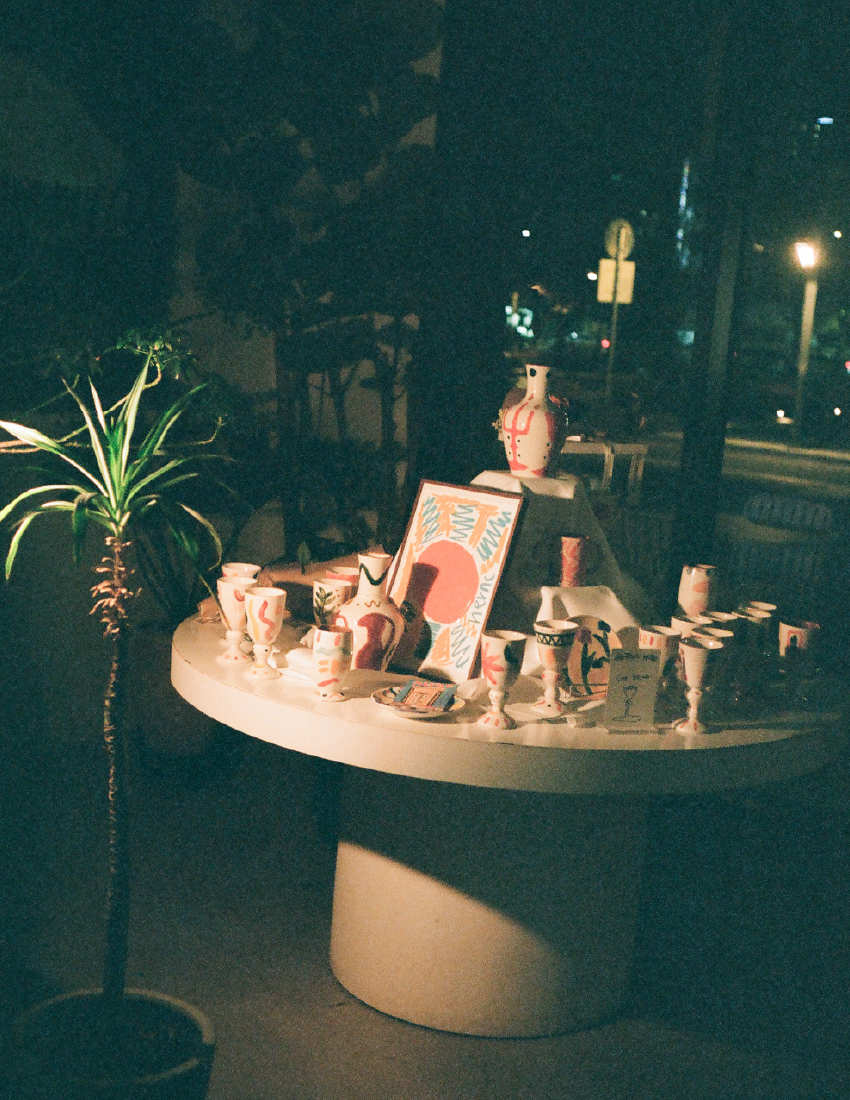 처음부터 전시를 하고 싶다고 생각했던 건 아니었어요. 와인을 좋아하는데, 와인은 내내 햇볕을 쬐어서 만들어지는 태양의 산물이잖아요. 와인과 빛, 태양, 자연을 결합한 이야기를 실질적으로 경험할 수 있게 하고 싶었어요. 보거나 만지기만 하는 건 한계가 있으니까요. 제가 만든 잔으로 와인을 마시는 게 좋았고, 그런 경험을 사람들과 나누고 싶어서 팝업 와인 바 형태를 차용해서 ‘잠깐 열어요. 놀러 오세요.’ 하는 느낌으로 진행하게 됐죠. 전시라기엔 아직 전시가 무엇인지 잘 모르겠어요. 방식에 한정되지 않고 제가 하고 싶은 대화를 하는 것에 집중하고 있습니다.