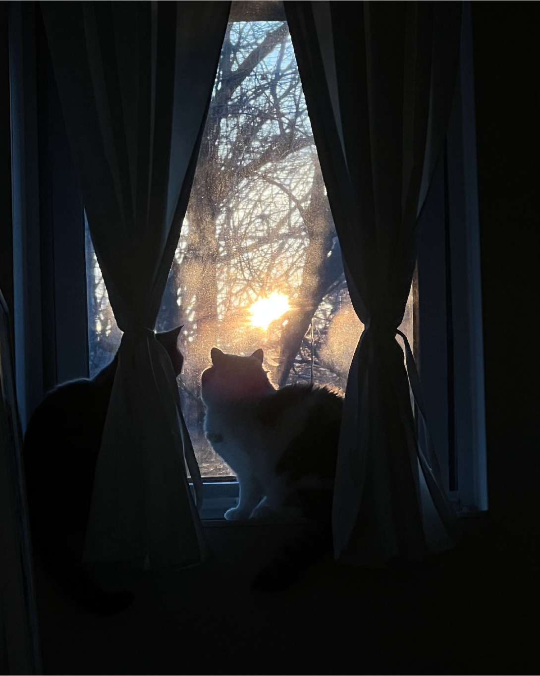 (앉아 있는 소파를 가리키며) 여기예요. 지금은 잘 안 보이는데, 아침에 창밖을 내다보면 저 나무로 계절이 변하는 게 보이거든요. 나뭇잎 색이 바뀌거나, 겨울에는 하얗게 눈이 쌓이기도 하고요. 그게 제일 잘 보이는 자리예요. 고양이들이 항상 저 위에 올라가 있어서 좋아하기도 해요. (웃음)